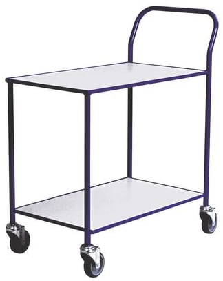 Pulverlackerad bordsvagn, skiva av 10 mm limmad laminat. Plastat greppvänligt handtag.