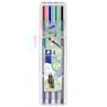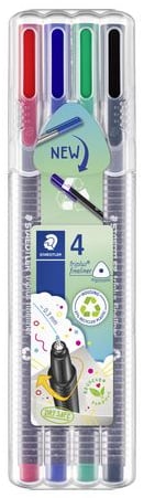 Stabila tryckbeständiga spetsar 0,3mm. Fiberpennor med ergonomisk trekantig design som ger en bekväm rit- och färgläggningsupplevelse. Pennorna har en ventilerad kork enligt gällande säkerhetsstandarder (ISO 11540 och BS 7272-1/2). De är torktåliga och kan ligga utan kork i flera dagar utan att bläcket torkar ut (gäller ej neonfärger, enligt ISO 554). Bläcket är vattenbaserat och kan tvättas bort från de flesta typer av tyg. Förpackningen innehåller 4 pennor i en praktisk plastbox från STAEDTLER. - 4/fp - ISO 11540 och BS 7272-1/2