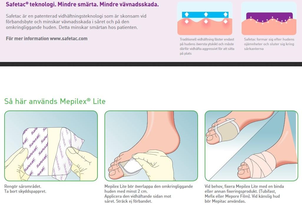 Tack vare Safetac minskas eller minimeras risken för att sår- eller hudskador uppstår när Mepilex Lite avlägsnas. Mepilex Lite är det perfekta valet för alla sorters lätt vätskande sår. Exempelvis för lätt vätskande kroniska sår som diabetiska sår eller bensår. Mepilex Lite är det enda förband som vid klinisk prövning visat sig ha effekt på, eller till och med kan förebygga, hudreaktioner i samband med strålbehandling.