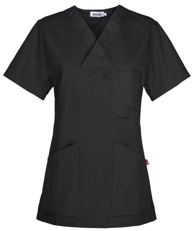 Snygg klassisk V-blus med figurnära och bekväm passform, något insvängd i midjan. Rymliga utanpåfickor fram, varav en med nyckelhållare och mobilficka. Bröstficka med korthållare. Modellen har något större skillnad mellan storlekarna.