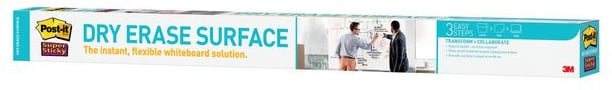 Post-it Easy Erase Whiteboard ger dig flexibiliteten att omedelbart förvandla din arbetsyta till en whiteboard och du kan skriva med en permanent tuschpenna utan förstöra ytan Rulla helt enkelt ut whiteboarden, klipp den till valfri storlek, dra av skyddsfilmen på baksidan och fäst den på en slät yta. Easy Erases unika material gör att whiteboardpennorna enkelt torkas bort med den medföljande trasan. Den permanenta pennan suddas med bara vatten och papper. Med användning av permanenta markörer är det mindre risk för oavsiktlig utsmetning eller radering. Den fäster säkert på olika ytor som målade gipsskivor, färdigt trä, glas, målat stål, whiteboards. När du är redo att ta bort den kan du vara säker på att den lossnar lätt och lämnar inte några klibbiga rester eller skador. Den är designad för engångsanvändning och erbjuder långvarig användning, men sitter så länge du vill.