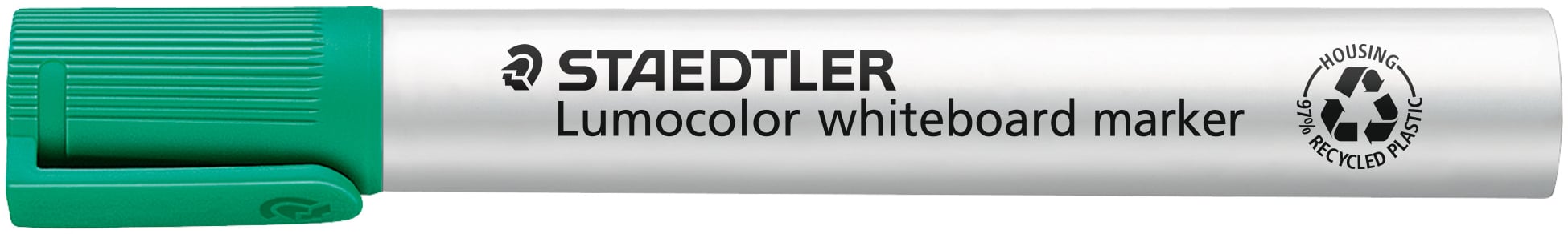 Lumocolor® Whiteboardpennor med rund spets tillverkad av 97 % återvunnen plast. Kan torrtorkas av whiteboards och ytor som glas och porslin, utan att lämna spår. Snabbtorkande, låg lukt. Låst spets. DRY SAFE - kan ligga utan kork i flera dagar utan att torka (Standard Atmosfär enligt ISO 554). Pennkropp och kork i PP garanterar lång livslängd. Flygplansäker - Automatisk tryckutjämning förhindrar att pennan läcker ombord på flygplan. Linjebredd ca 2 mm. Pennfodralet är tillverkat av 97 % återvunnen plast, enligt ISO 14021 (skaft, hätta och ända).